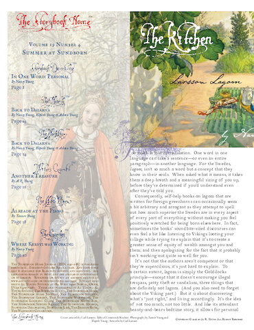 By Al R. Young The Sundborn Summer issue of The Storybook Home Journal is now available from Al Young Studios.  This issue features these regular sections:Decorating - In One Word: Personal (5 pages)Hearth - Back to Dalarna (1 page)Kitchen - Larsson Lagom (13 pages)Music - Already at the Piano (2 pages)Garden - Where Kersti was Working (3 pages)Workshops - Back to Dalarna (2 pages)Garret - Another Treasure (2 pages)Sundborn Summer is the 118th issue of the Journal, published bi-monthly since November 2000... Read more »