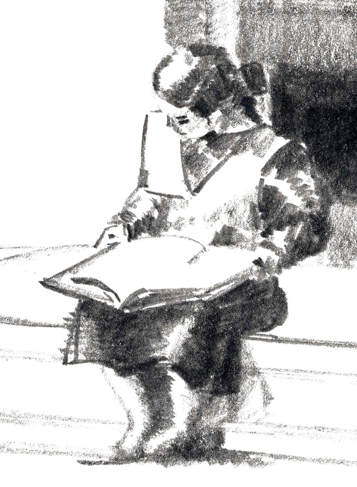 To sketch with a pencil, however, it is usually best to hold the tool under the palm of the hand, and between the thumb and forefingers. In this arrangement, the vise-like grip of writing or drawing loosens, and the origin of motion naturally moves from wrist, to elbow and shoulder. The larger radius of motion also usually requires a larger surface on which to work, even a larger space in which to do so. This is the result: