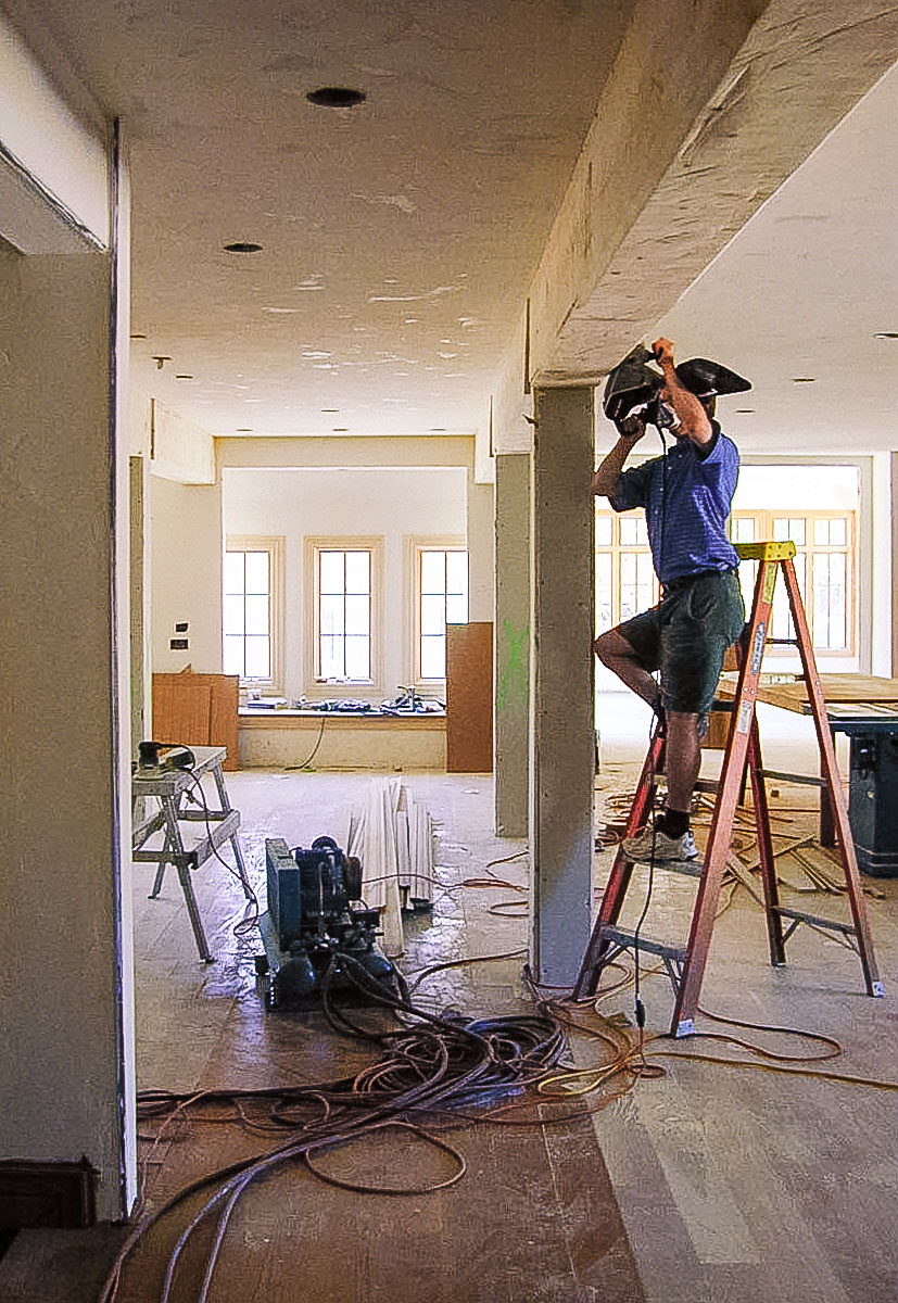 | The backing, or reinforcement, of each seam and the fact that grabbers are offset from the seams lend strength to the joinery and allow for chamfers to complete the illusion of post and beam members. |