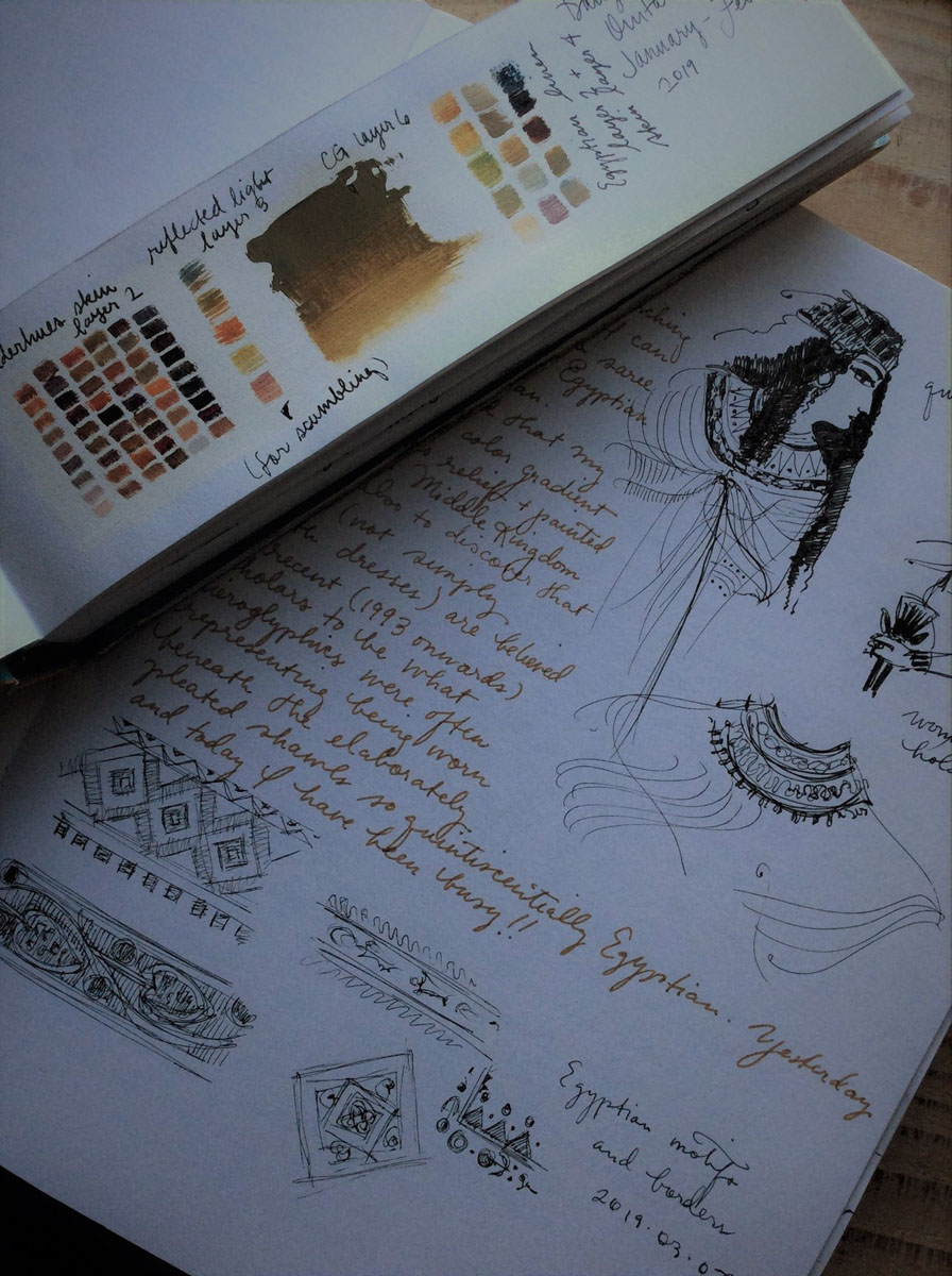 February 27, 2019 This week I've been painting up a storm on the daughter of Onitah; also participating in a research frenzy to ensure I can visually adopt a saree into an ancient Egyptian outfit. And I can! I am pleased that my background color gradient echos bas relief and painted murals in Middle Kingdom Egypt; also the discovery that the tunics and not simply sheath dresses, I believe by recent (as in 1993 onwards) scholars to be what hieroglyphics were often representing being worn beneath the elaborately pleated shawls so quintessentially Egyptian.