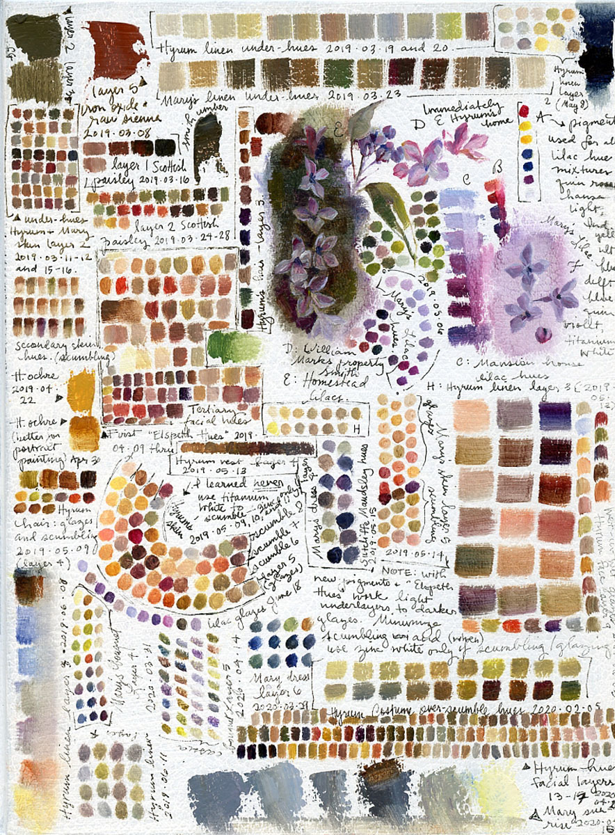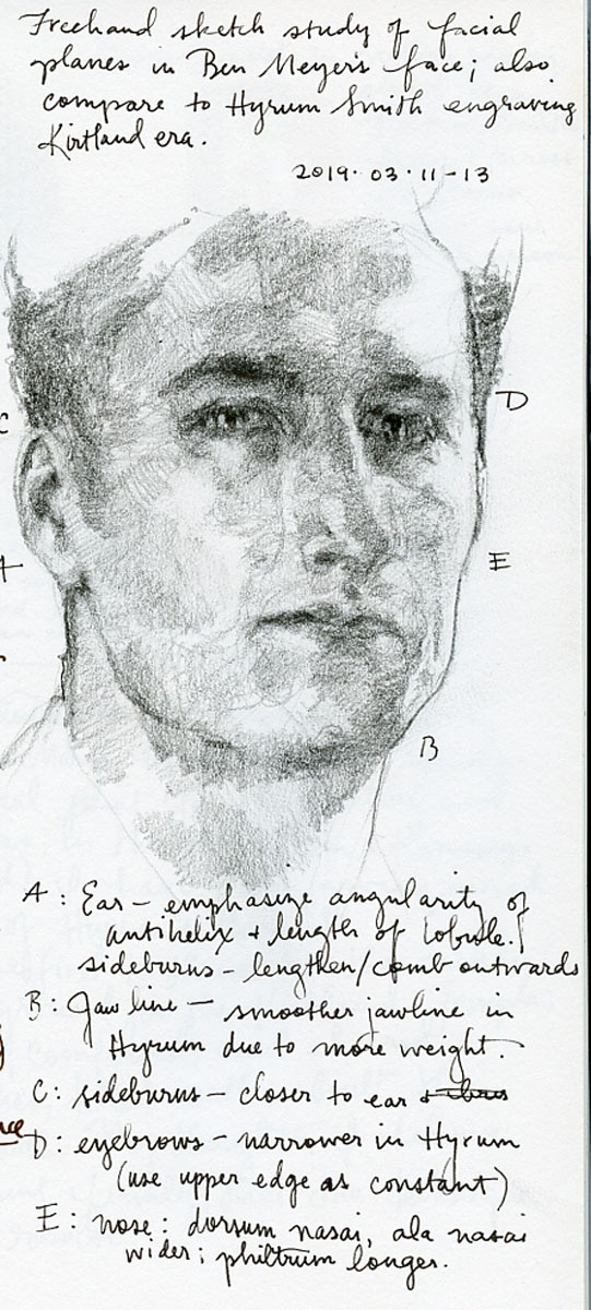March 13, 2019 I spent Monday and Tuesday using chalky, two- to three-day-old paint to sketch-in the facial planes of Hyrum and Mary using mid-tone hues. I counted in excess of 130 color-fractal-plane changes per face.