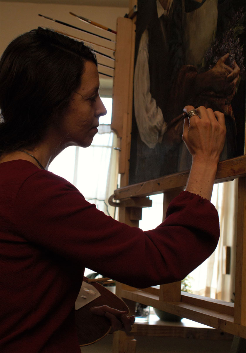 May 16, 2019 Breathless and exhausted, I write perched in the studio corner just above the fading lilacs whose fragrance has been my muse and companion through the past two weeks of insane painting. With rare exception, every waking moment, from the small hours, has me focused on the Smiths, until paintbrush poised and eyes straining, the last hints of daylight slip into darkness each night. I study faces in portraits, extant from Nauvoo, descendants in photographs, clothing artifacts, written and oral tributes, period-accurate films for costume interpretation ideas, and, probably most importantly, my heart, for feelings about Hyrum and dear Mary I hope to echo in every brushstroke. The entire painting has undergone a complete and extreme makeover and miles to go, but an evocative image begins to emerge from within.
