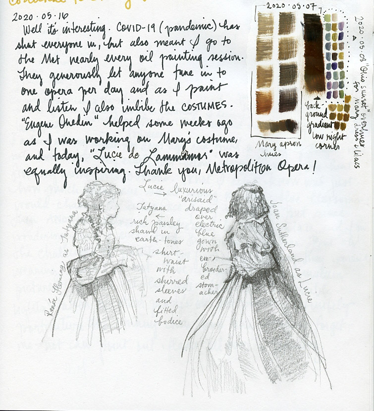 May 16, 2020 Well it's interesting. The COVID-19 pandemic has shut everyone in, but also means I go to The MET nearly every oil painting session. They generously let anyone tune in to one opera per day and as I paint, I listen. I also imbibe the costumes. Eugene Onedin helped some weeks ago as I was working on Mary's costume, and today, Lucie de Lammermor was equally inspiring. Thank you, Metropolitan Opera!